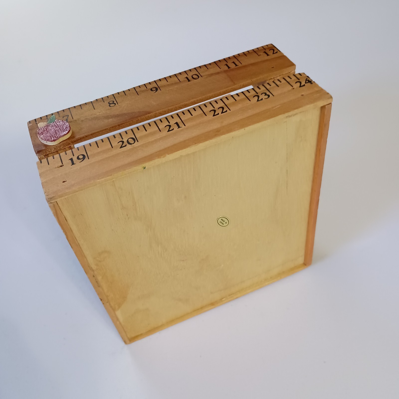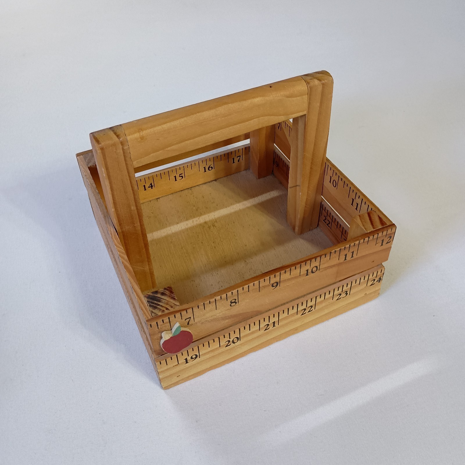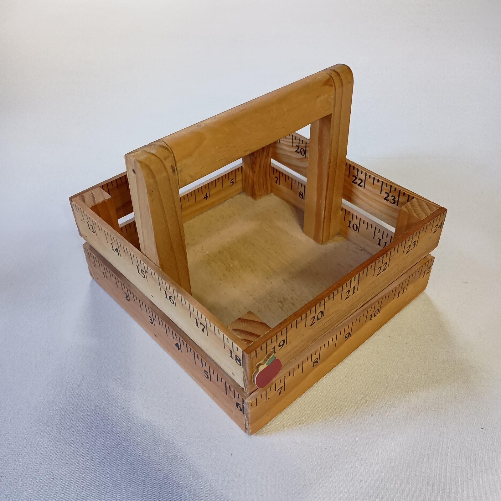 This Wooden Ruler Box Caddy is a charming and functional decorative accessory for your home. Handcrafted from yardsticks, it features a square shape and natural wood color, perfect for adding a touch of country farmhouse style to your space. With dimensions of 6" in length, 5" in height, and 6" in width, this medium-sized box caddy is a versatile piece that can hold various items such as rulers, paintbrushes, or even small decor items. The free-standing design and lack of assembly requirements make it easy to display in any room of your home. Normal wear. Sizes are approximate.