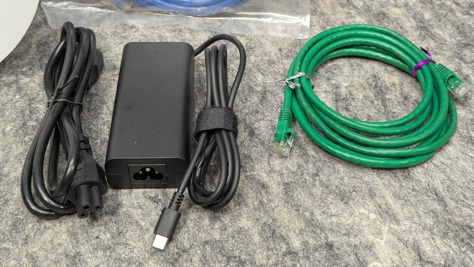 Cleaned and disinfected. Tested to power on only. Usage wear as shown in the pictures. Nothing that affects its functionality. I was able to power it on with the included generic USB-C power supply; no other testing has been done. Comes with a new Ethernet Cables.