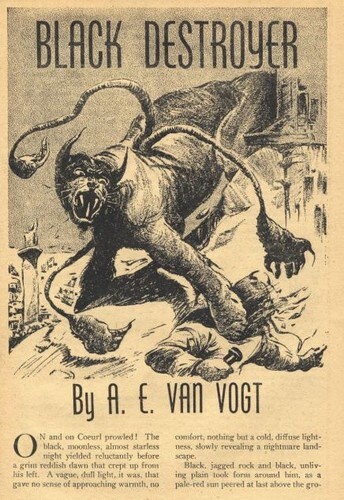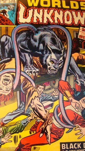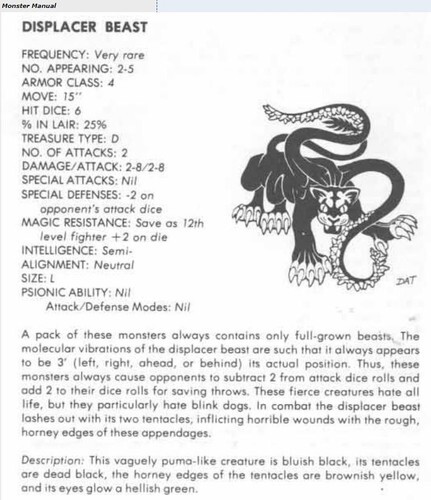 D D FANS WILL ACKNOWLEDGE THAT THE DISPLACER BEAST IS ONE OF THE COOLER OLD SCHOOL MONSTERS AND MADE AN APPEARANCE IN THE MOVIE HONOR AMONG THIEVES. GARY GYGAX AND THE ORIGINAL D D GANG WERE BIG FANS OF THE PULPS AND COMICS. THE FIRST ITERATION OF THE DISPLACER BEAST WAS CALLED THE COEURL ALSO KNOWN AS THE BLACK DESTROYER BY VOGT IN ASTOUNDING TALES WAY BACK. WORLDS UNKNOWN THEN REPRINTED THE STORY IN 1972... WITH MORE DEFINED ART. THEN IN 1978 THE DISPLACER BEAST WAS "STOLEN" AND INCORPORATED INTO THE 1ST EDITION MONSTER MANUAL. TSR RECOGNIZES THE LINK IN DRAGON MAGAZINE MONSTER ECOLOGIES. PLEASE SEE ALL PICTURES.
