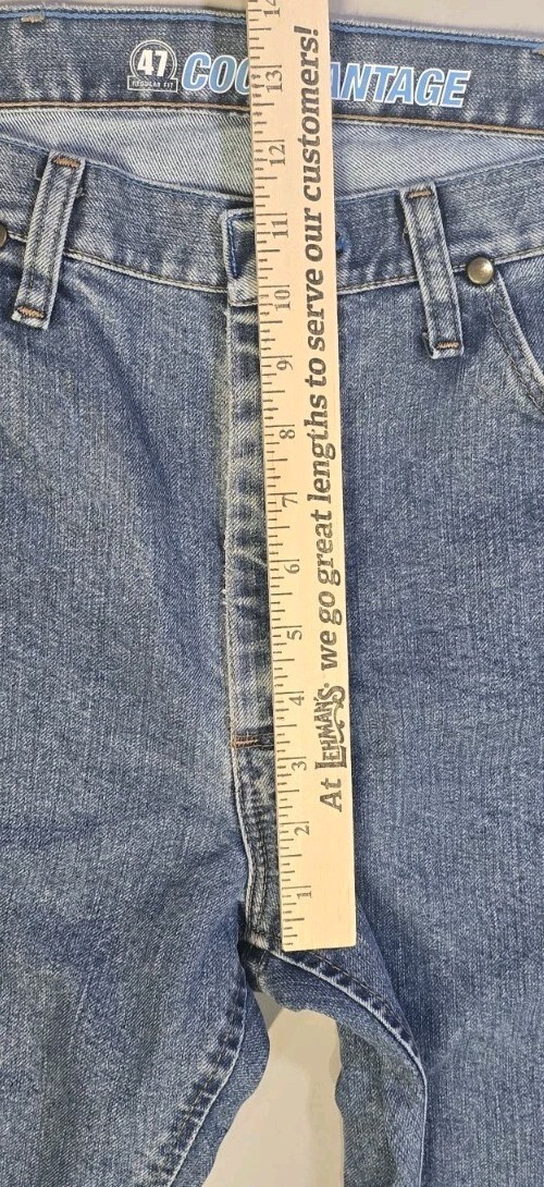 Labeled 33x34 measured 33x35. The Wrangler 47 Cool Vantage Regular Fit Men's Jeans 47MCVLS in size 33x34 is a stylish and durable denim pant featuring a mid-rise, 5-pocket design with a bootcut style. Made from a cotton blend fabric with a medium wash, these jeans are machine washable and easy to care for. The classic blue color, solid pattern, and American theme make them a versatile and comfortable choice for everyday wear. With premium performance features and belt loops for added convenience, these Wrangler jeans are a quality option for men looking for a reliable and fashionable addition to their wardrobe.