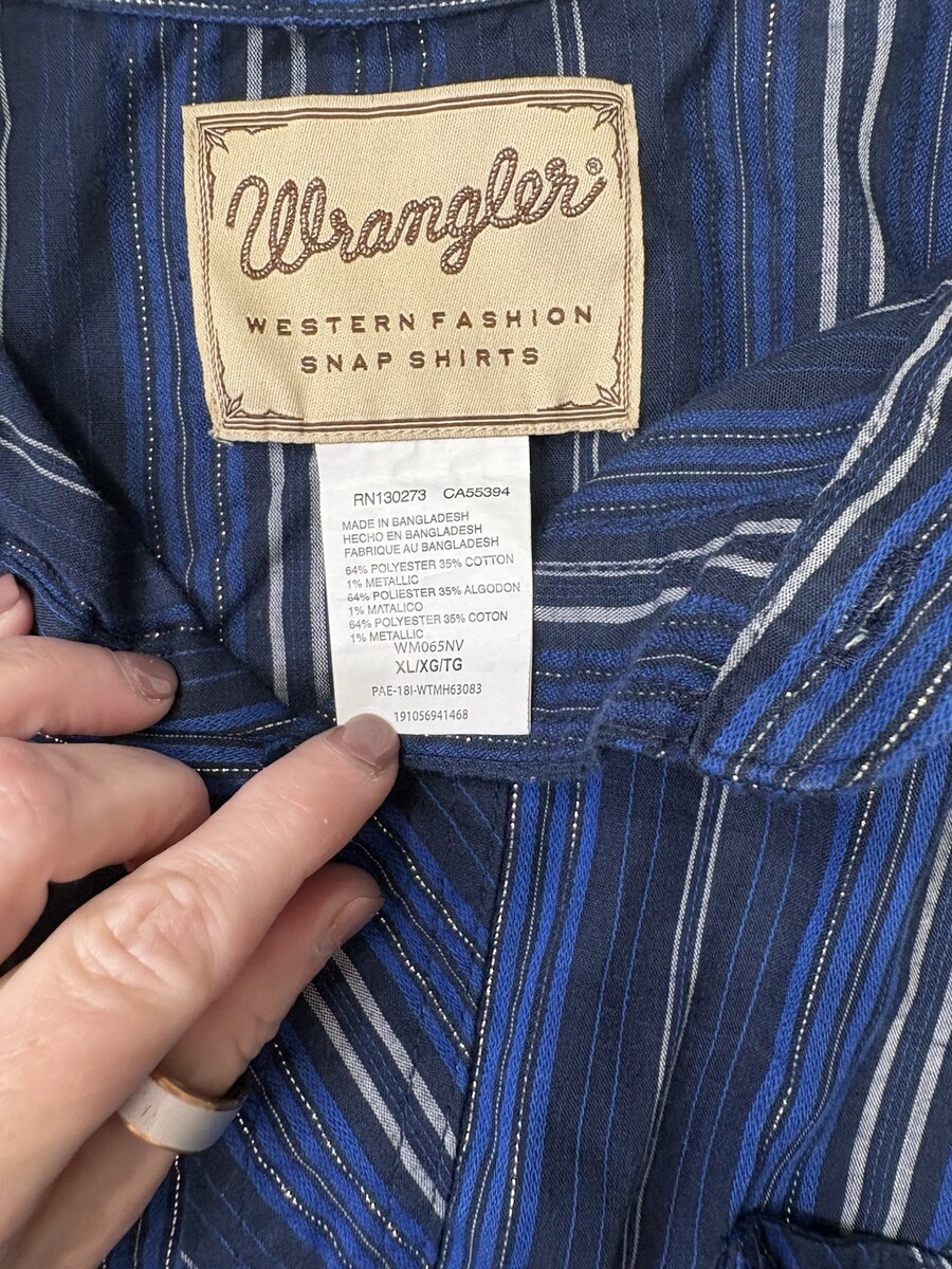 - Wrangler Mens XL Pearl Snap Blue Silver Metallic Stripe Rodeo Western Shirt