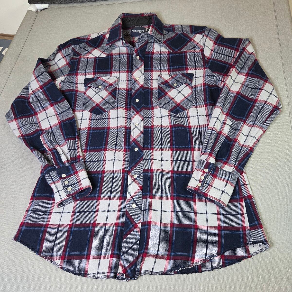 Classic Wrangler western pearl snap shirt featuring a bold red, white, and navy plaid pattern. Made with durable mid-weight flannel and finished with iconic pearl snaps and double flap chest pockets. Shirt is in good preowned condition with no holes, tears, or noticeable stains. Great for workwear, ranch wear, or everyday casual western style.