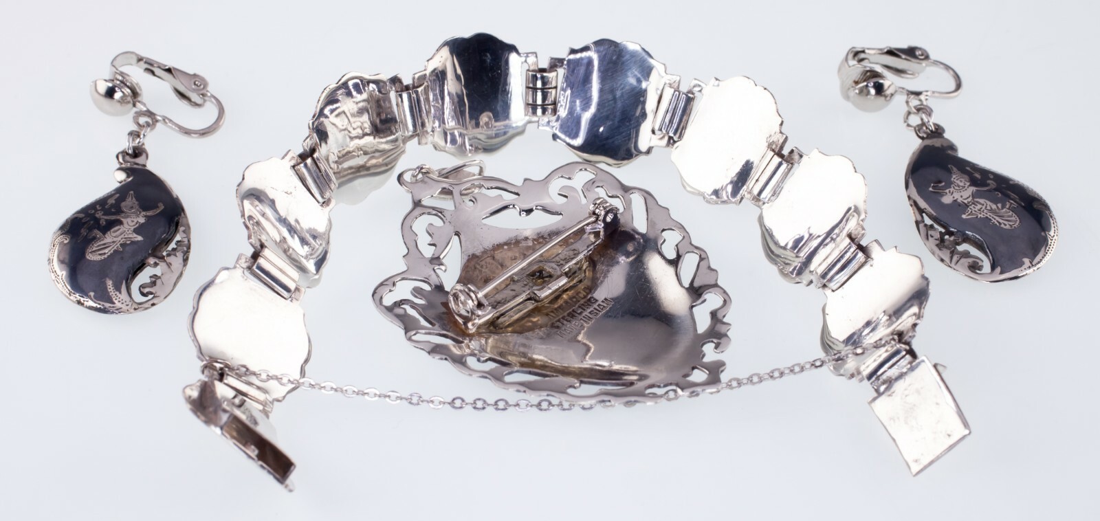 Wunderschones Sterlingsilber -Niello -Schmuckset (Ohrringe, Armband, Anhanger)