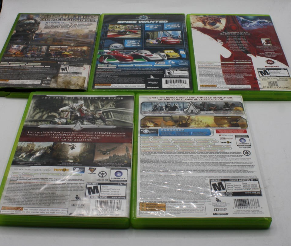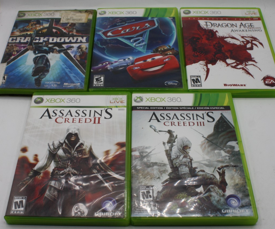 - Xbox 360 Lot of 5 Games: Assassins Creed II & III, Cars 2, Dragon Age Awakening
