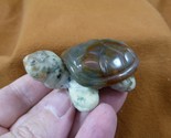 (internal #Y-TUR-LAT-737) Great little figurine of a 2 piece Tortoise TURTLE, 2-1/4" long. Excellent quality of polished, natural brown tan green fancy jasper shell and green striped serpentine body.