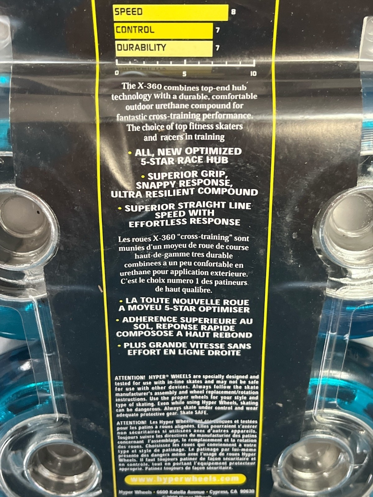 Vintage factory-sealed set of Hyper Wheels X-360 inline skate wheels. Designed for high-performance cross-training, these wheels combine durable urethane with an optimized 5-star race hub for excellent grip, control, and straight-line speed. A great collectible or upgrade for vintage skates.