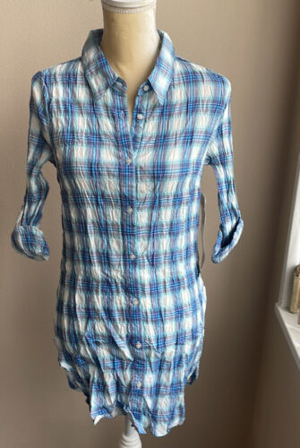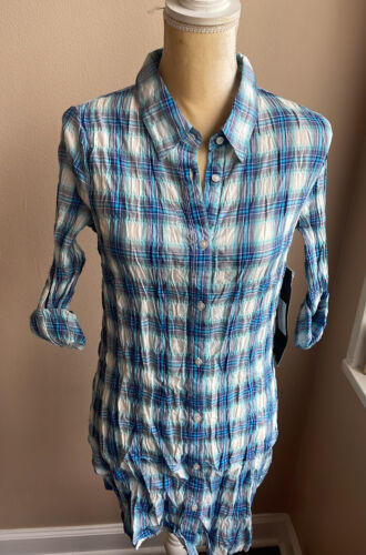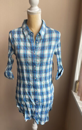YMI Womens tunic Top sz M Blue Plaid Rolled Cuff sleeves New