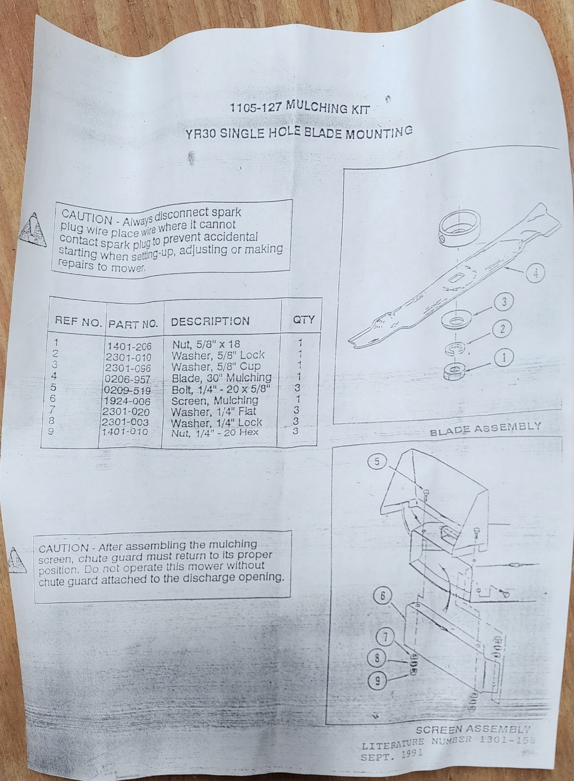 - Yazoo 1105-127 Mulching Kit 30" fits YR30 Rectangle Hole New and Ugly OEM