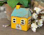 This charming tealight holder, with a small yellow glaze, features an aqua roof, cream windows, and a grey double door.