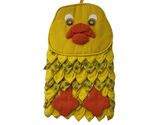 This is a single yellow duck-themed oven mitt designed for kitchen use. The oven mitt features a cotton cover with polyurethane filling, providing insulation for handling hot cookware. The front side showcases a duck face with button eyes, a sewn orange beak, and layered fabric feathers in solid yellow and patterned yellow fabric with red and brown floral motifs. The back side is fully covered in the same patterned yellow fabric. It includes a hanging loop at the top for convenient storage.