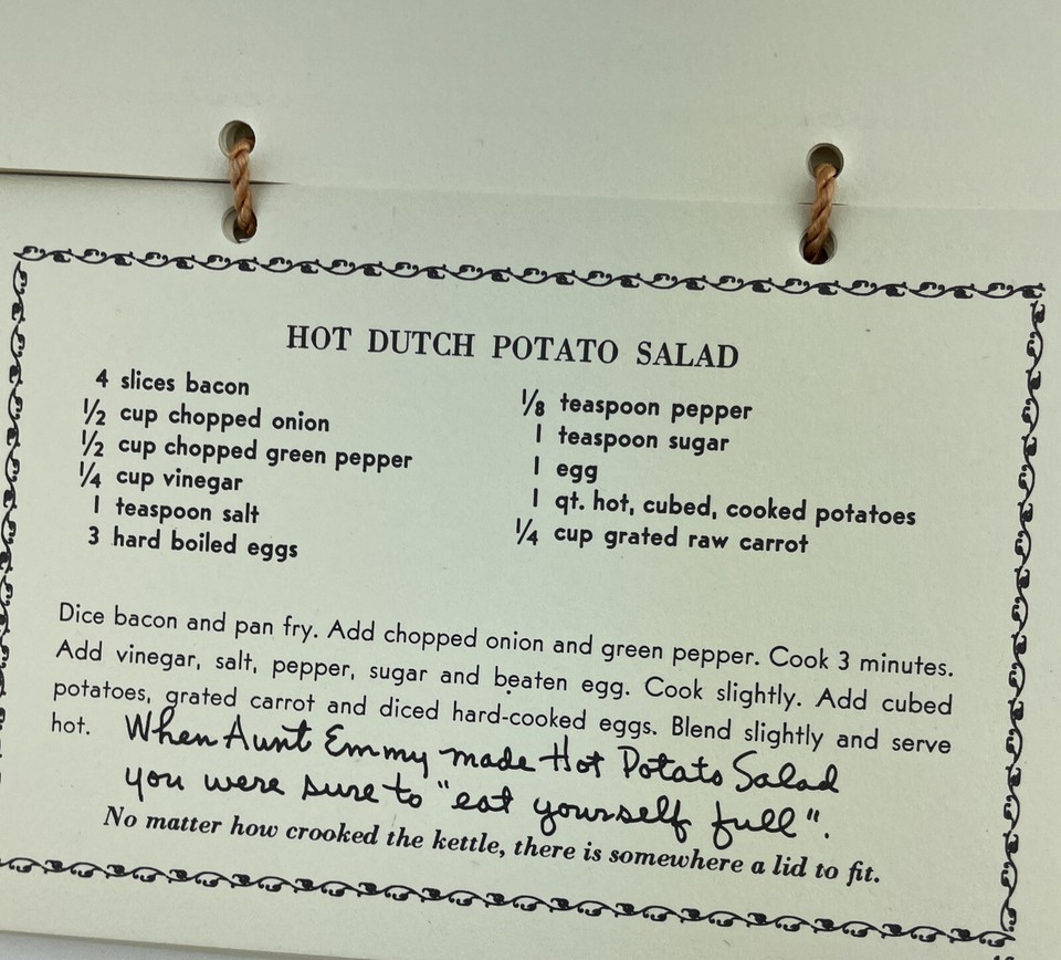 Spiced with quaint Dutch proverbs such as "When Aunt Emmy make Hot Potato Salad you were sure to "eat yourself full" and as Dutch as Sauerkraut.