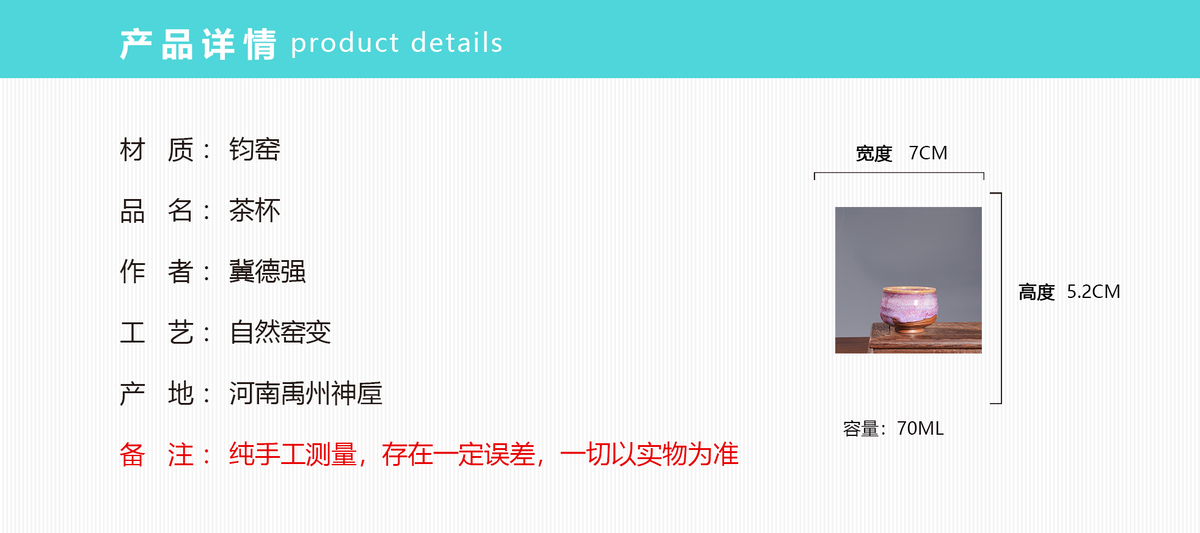 Handcrafted in Yuzhou (the 1,000+ year-old birthplace of Jun Porcelain) by master artisan Ji Deqiang (Xucaitang Studio), a 20+ year expert in traditional wood-fired Jun Porcelain. This piece honors Yuzhou’s iconic ceramic legacy — a craft recognized for its unique kiln-change artistry.