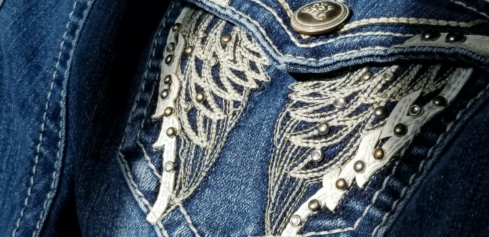 ZCO Juniors Size 5, inseam 26 Distressed, wings on back pockets Capri Stretch