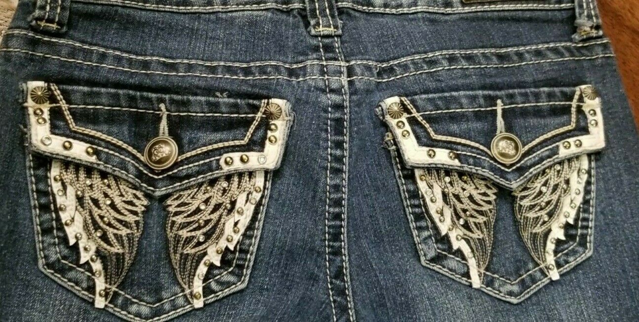 So Cute, ZCO Juniors Size 4, inseam 26 Distressed, wings on back pockets Capri Stretch. One of the back belt loops has a small cut. Condition is Pre-owned.