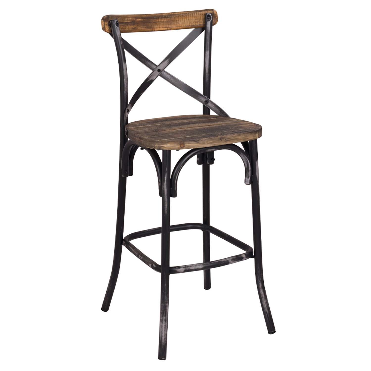 Features: Armless Bar Chair (High Back) Stationary Seat Wooden Seat: Walnut Finish (China Fir), (No Apron Seat) Backrest: Metal "X" Shape with Wooden Slat Metal Splayed Leg Footrest: Antique Hand Brush Finish, Steel Spray Painting, Clearance Floor to Footrest: Est. 13" Set Includes: One (1) Bar Chair