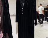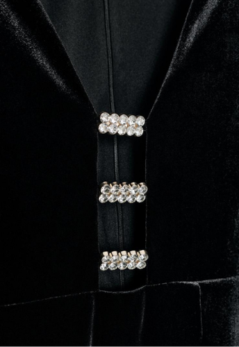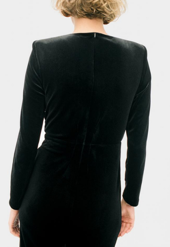 Dress black featuring a plunging v-neckline with shiny appliques. Long sleeves with shoulder pads. Hem with a front vent. Back zip fastening concealed in the seam..