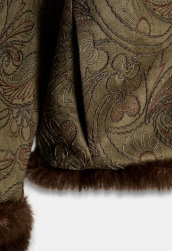 Jacket dark khaki with a combined fabric featuring embroidery and a faux fur interior. Lapel collar and long sleeves. Front pockets. Front hook-and-eye fastening.