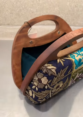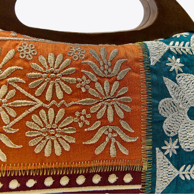 Box patchwork bag. Features floral embroidery and contrasting metallic thread detailing. Lined interior. Wooden top handle.