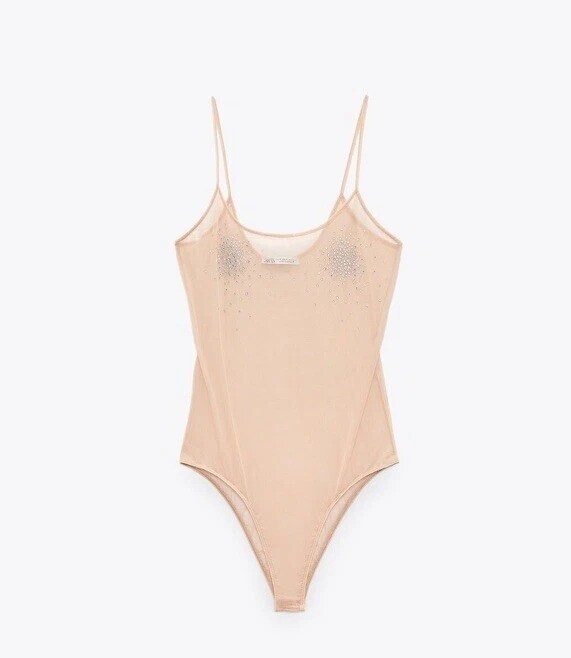 - Zara Sheer Nude Mesh Bodysuit W/ Rhinestone Detail Spaghetti Straps S