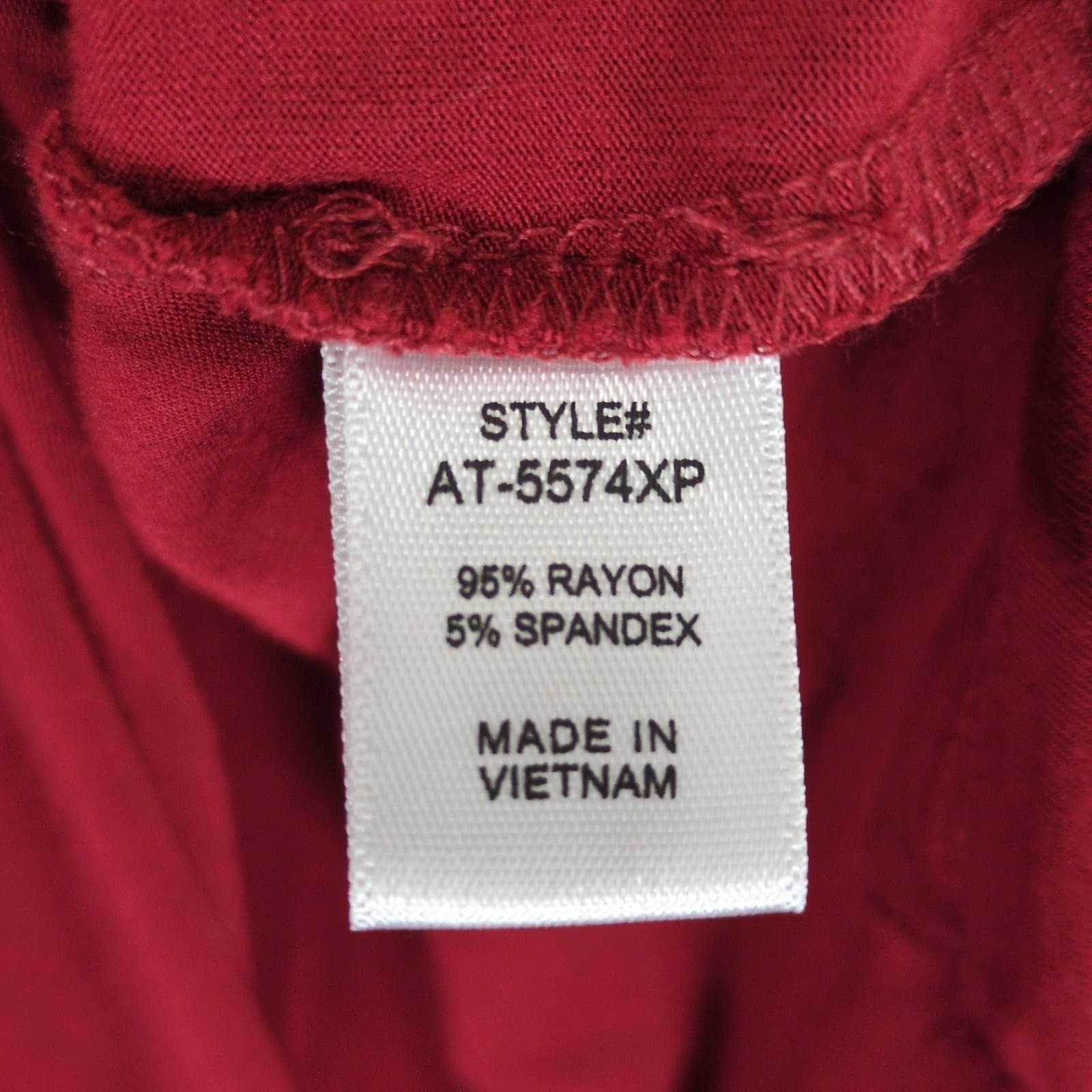 * Features: Stretch fabric, dolman sleeves, round neckline, longer tunic length, ruched sides, center back seam, burgundy shade