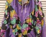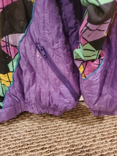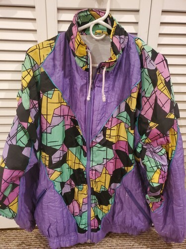 Unsure of brand (tag was removed), but really nice light jacket. Colors are purple/green/pink/yellow - overall vapor inspired, reminiscent of the 90s. Women's size L. Color fading slightly on left zipper pocket (see pictures) and zipper looks like it was repaired at some point, but otherwise, great condition.