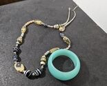 Acrylic 37" necklace with black and white and khaki beads paired with a jade extra wide slip on bracelet.