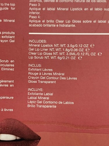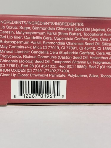 | Set Includes: | Lip Scrub, Lipstick, Lip Liner, Clear Lip Gloss |