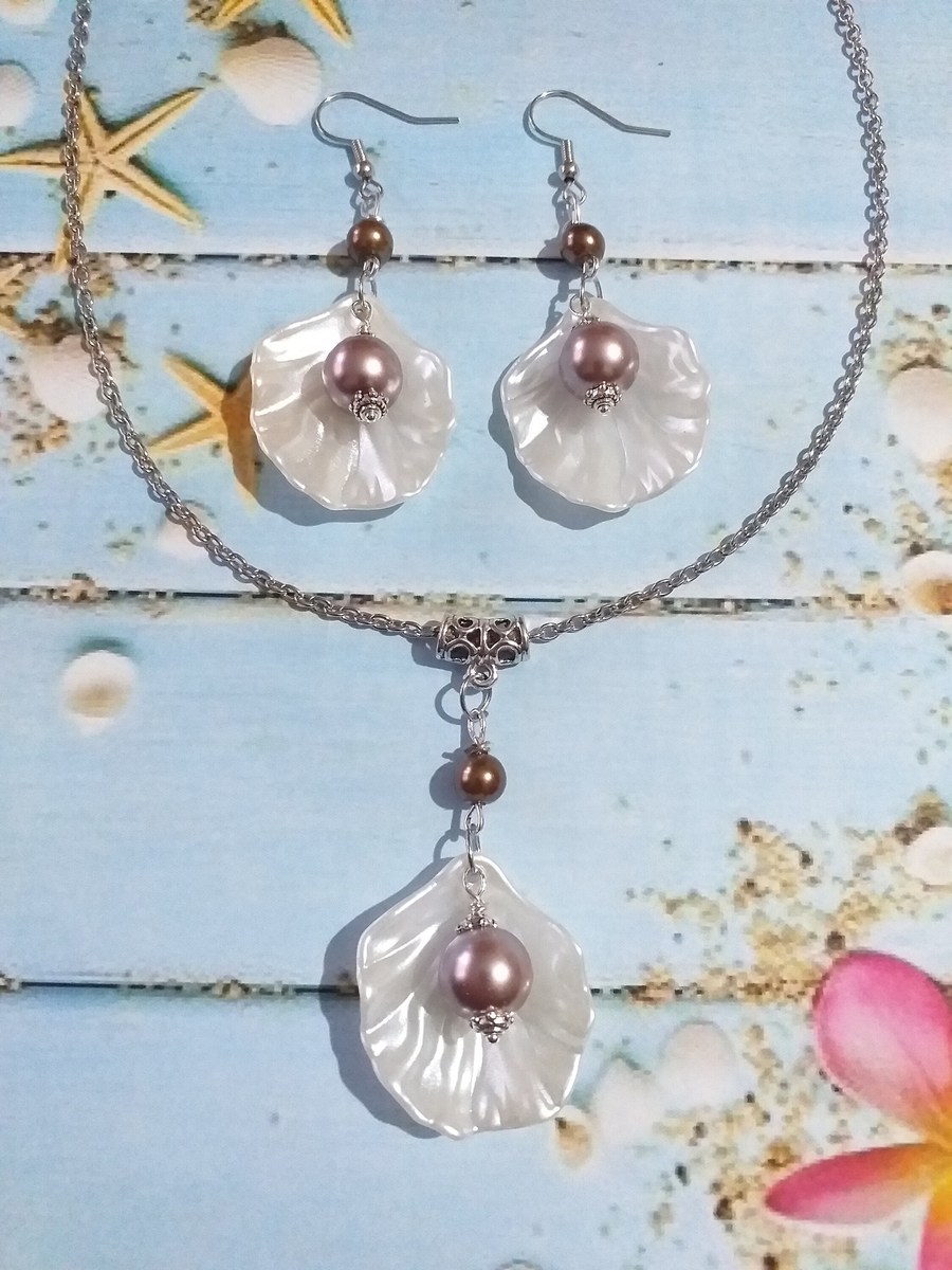 Beautiful jewelry set with white plastic sea shells and crystal brown pearls beads . Boho set necklace and earrings. Bohemian necklace and earrings .