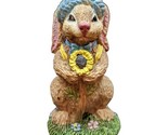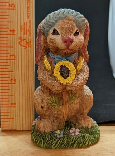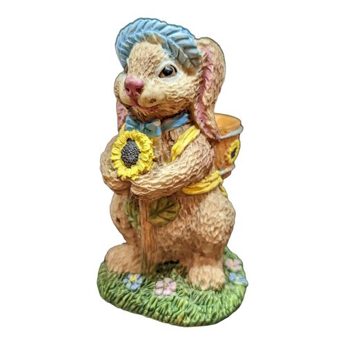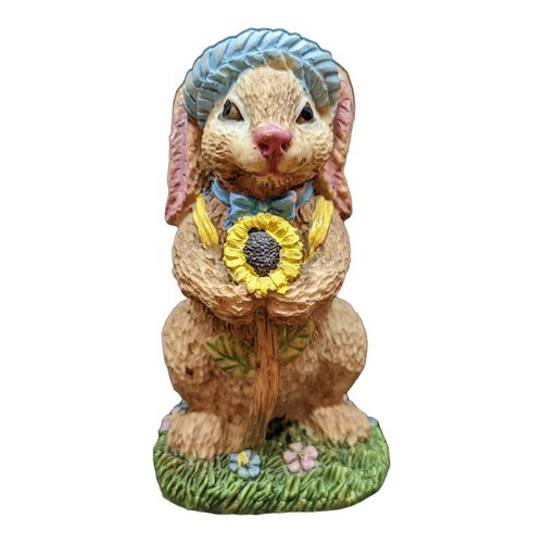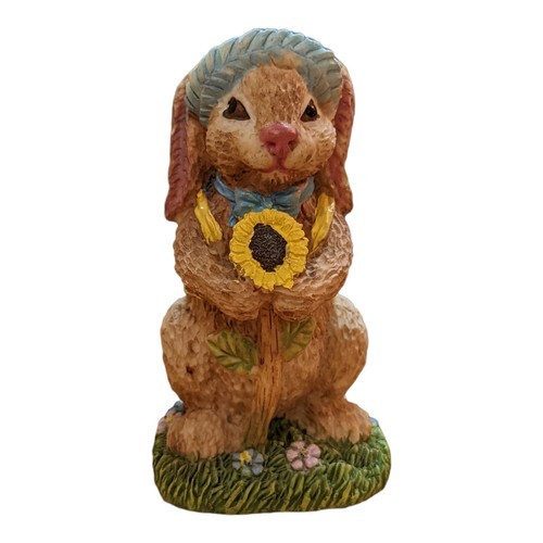 Bunny figurine with blue straw hat holding a large sunflower standing on green grass with flowers base