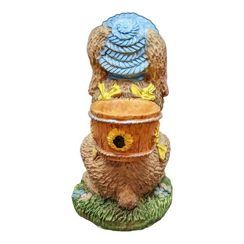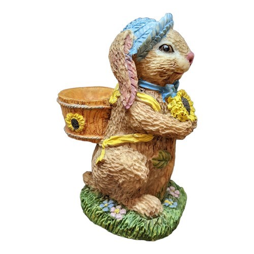 - bunny figurine blue straw hat sun flower wood basket egg holder vintage Easter
