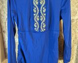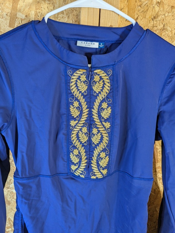 This is a Cabana Life top in blue with a floral pattern, designed for sun protection. Made of nylon and spandex, it features a zipper, embroidered accents, and a drawstring. The top is hand wash only and has UV-protection, long sleeves, and stretch fabric. Perfect for beach outings, this size M garment is suitable for women.