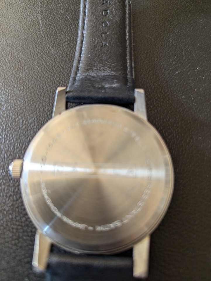 This cadola spinthrift men's watch features a round, polished stainless steel case with a two-piece black leather strap and a butterfly clasp closure. The watch has a silver bezel color, silver case color, and black dial color. It is water-resistant up to 50 meters and scratch-resistant.