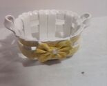 Lattice work pottery basket painted yellow and white with folded handles and bow on the front. Bottom says made for casafina in Portugal. Number 3607 could be a model number or a series number.