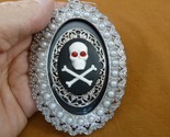 Ornament has a cameo of a Skull and crossbones. New, molded from resin, this is a medium cameo in WHITE color with BLACK background color with red eye accents, mounted on black backing and set into the silver tone ornament (see last photo for an example).
