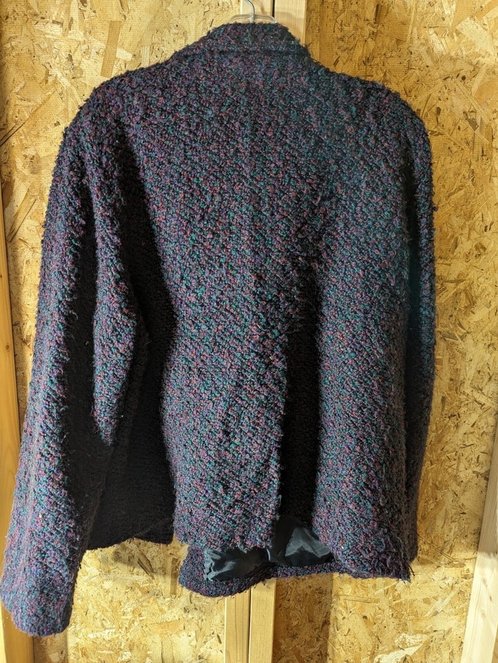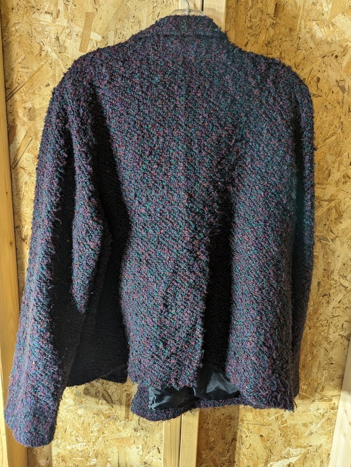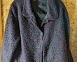 This is a women's crocheted jacket from Coldwater Creek in size XL. The jacket has a short length and long sleeves with a collared neckline and button closure. It is made of a polyester blend outer shell and lined with polyester. The fabric type is crochet and the jacket is not vintage. It features a multicolor design and is recommended to be dry cleaned only.