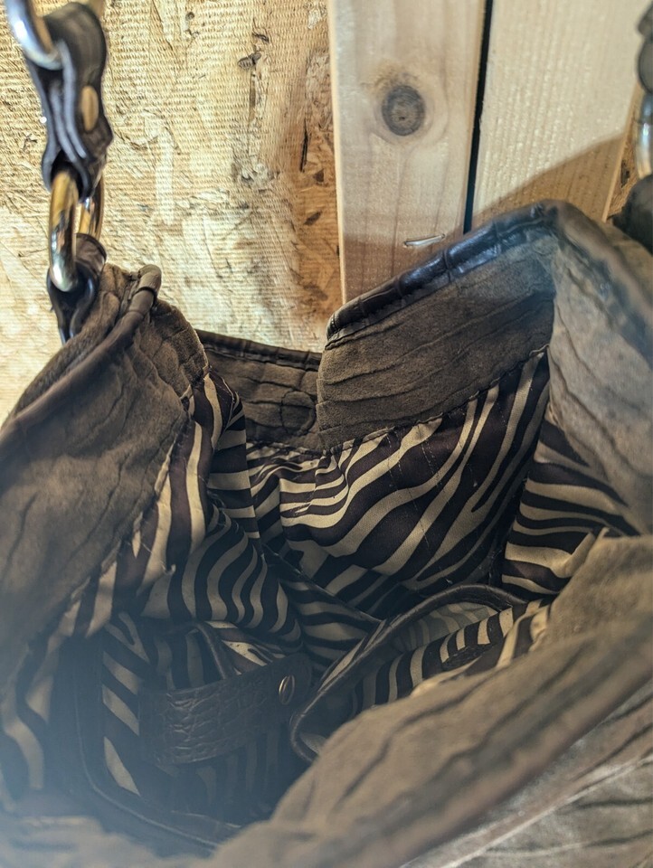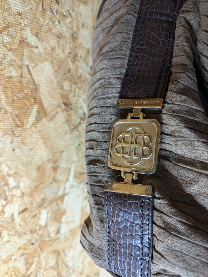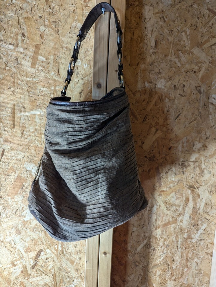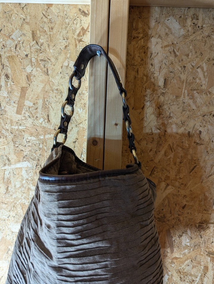 Elevate your accessory collection with the Dana Buchman tote, a perfect blend of style and functionality. Crafted from luxurious faux suede in a versatile brown hue, this large-sized bag measures 12 inches in width and 13 inches in height and depth, providing ample space for your daily essentials. The tote features a sturdy stainless steel and leather chain strap, ensuring durability and comfort when carried.