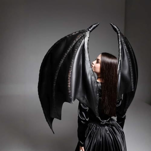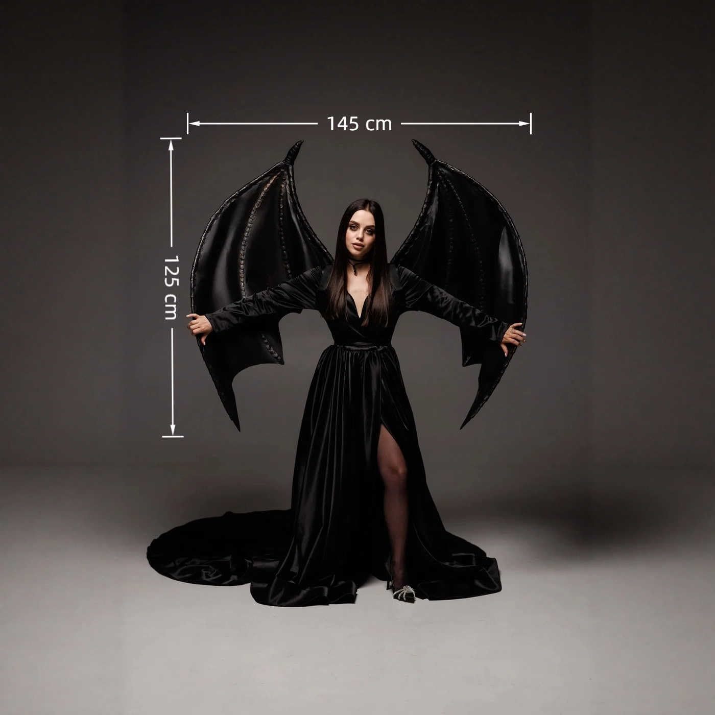 Product description: Transform into a creature of the night with these impressive Black Dragon Bat Vampire Wings. Designed specifically for adults seeking a bold costume transformation, these wings span an impressive 145 cm wide by 125 cm high, creating a striking silhouette that commands attention. The lightweight composite construction ensures comfort during extended wear while maintaining the dramatic gothic aesthetic perfect for Halloween, cosplay events, theatrical performances, or fantasy fashion shows. Featuring sturdy armature and comfortable shoulder attachments, these wings accommodate most adult body types and heights between 150-180 cm. The slightly glossy black finish catches light dramatically, enhancing your presence whether you're portraying a vampire, demon, dark angel, or dragon character. The reinforced contour maintains the bat-inspired shape throughout your event, allowing for walking, posing, and even dancing while wearing these statement wings. Durable enough for repeated use and designed for maximum visual impact in photos and crowds.