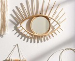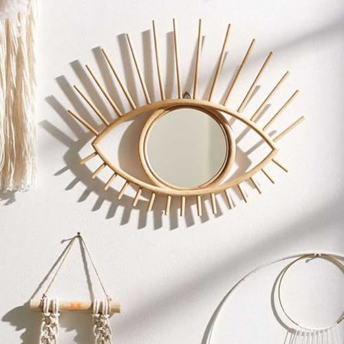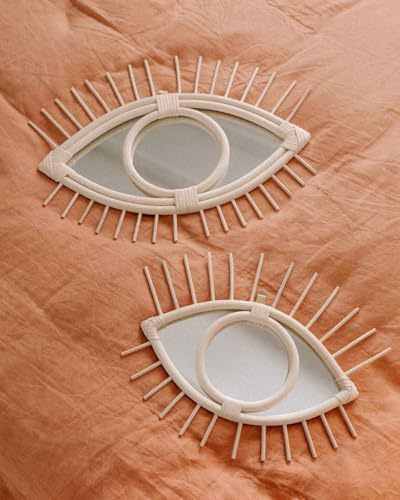 Product description: Transform your space with this captivating Evil Eye Rattan Wall Mirror. Measuring 21.6 by 14.8 inches, this handcrafted piece blends folk heritage with contemporary design through its symbolic eye form and bold rattan lashes. The striking sunburst pattern serves as both a decorative focal point and a conversation starter in any room. Meticulously crafted from premium imported rattan, this lightweight yet sturdy mirror brings natural texture and warmth to bedrooms, living rooms, entryways, or creative spaces. Its artistic design multiplies natural light while adding personality and global mystique to your decor. The mirror comes ready to hang with an attached wall hook for effortless installation. Whether used as a standalone statement piece or as part of a curated gallery wall, this Interoknack mirror delivers timeless decorative impact with its vintage-meets-modern aesthetic.