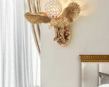 Product description: Transform your space with this striking golden eagle wall sconce light. The meticulously sculpted resin eagle, captured in mid-flight with wings majestically spread, creates a bold artistic statement in any room. Finished in gleaming gold, this 13-inch tall by 17.7-inch wide fixture commands attention while the 5.1-inch crystal globe shade above casts a warm, sparkling glow throughout your space. The dramatic flying eagle motif adds sophistication to living rooms, bedrooms, offices, staircases, and entertainment areas. With its substantial 9.1-inch projection from the wall, this fixture creates a three-dimensional art piece that doubles as functional lighting. The E27-compatible sconce includes an energy-saving LED bulb for immediate enjoyment. Crafted with attention to detail, this unique decorative lamp combines luxury aesthetics with practical illumination for years of enjoyment.