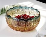 Product description: Elevate your home decor with this stunning crystal glass fruit bowl that seamlessly blends artistry with functionality. The bowl features an enchanting gradient that transitions from warm amber to cool teal, creating a mesmerizing visual display that changes throughout the day. Intricate embossed star patterns and geometric motifs dance across the surface, catching light to create dazzling reflections. Measuring 8.3 inches in diameter and 3.1 inches in height, this versatile serving piece offers generous space for displaying fresh fruits, candies, or decorative items. The traditional pressed glass craftsmanship shines through in every detail, from the precisely molded star designs to the gracefully scalloped rim. Whether gracing your coffee table, dining area, or kitchen island, this bowl serves as both a practical serving dish and an elegant decorative accent that adds sophistication to any setting. The substantial crystal glass construction ensures this piece maintains its beauty while being suitable for regular use.