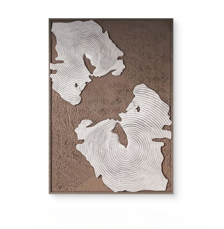 Product description: Transform your space with this exquisite minimalist 3D relief sculptural wall art from Interoknack. Featuring dual white concave sculptural reliefs set against a richly textured brown background, this hand-painted piece creates a perfect balance between tranquility and creative abstraction. The expertly hand-carved concentric patterns showcase natural asymmetry and spatial layering, adding depth and dimension to any room. Measuring 60 x 80 cm (24 x 31 inches), this medium-small format artwork is framed in quality solid wood, making it substantial yet versatile for various spaces. The tactile oil texture provides a strong sense of dimension and artistry, while the neutral earth-tone palette seamlessly integrates with minimalist, wabi-sabi, or luxury interiors. Ideal as a focal point in living rooms, entryways, corridors, or gallery walls, this sculptural piece elevates your decor with understated luxury and organic minimalism.