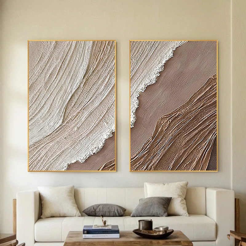 Product description: Transform your living space with this stunning Modern Abstract Textured Ocean Waves Hand-Painted Canvas Wall Art Set by Interoknack. Each piece showcases the serene movement of ocean waves through rich, three-dimensional textures meticulously created by skilled artists. Measuring an impressive 24 x 32 inches, this statement piece commands attention whether placed above a sofa, in a hallway, or near an entryway. The premium canvas is elegantly framed in sleek black aluminum alloy, combining contemporary style with lasting durability. The artwork's abstract composition ensures versatility across various interior design styles, particularly complementing minimalist and neutral color schemes. Ready to hang, this hand-painted masterpiece adds sophistication and artistic flair to living rooms, offices, or bedrooms. The textured details capture light beautifully, creating a dynamic visual experience that changes subtly throughout the day, bringing the calming essence of ocean waves into your home.