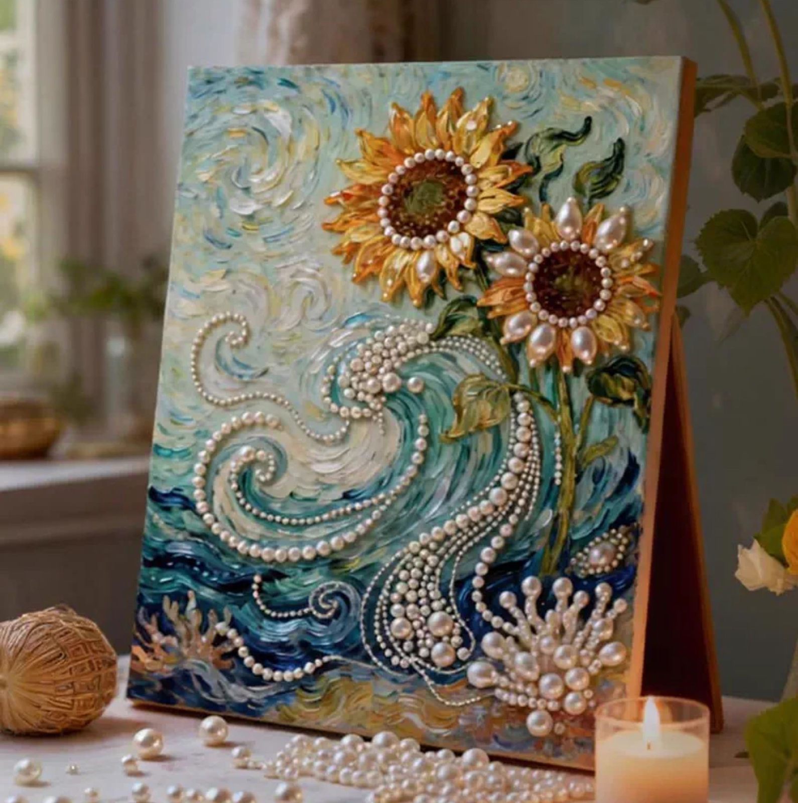 Product description: Transform your space with this exquisite Modern Pearl Sunflower Texture Art Desktop Decoration. This stunning 40 x 60 cm (15.7 x 23.6 inches) piece combines a modern matte microprint with hand-embellished pearls, creating a tactile, luxurious effect that captivates viewers. The high-resolution art is printed on artist-grade paper with a sophisticated matte finish that reduces glare while enhancing color depth. Housed in a contemporary brushed black aluminum alloy frame that's both lightweight and durable, this handmade artwork is ready to become the centerpiece of any room. Perfect for minimalist apartments, luxury living rooms, hotel lobbies, or sophisticated entryways, this versatile piece can be displayed as a wall hanging or standing decoration. Every aspect of this artisanal creation?from size to pearl details to frame finish?can be customized to perfectly complement your unique interior design vision.