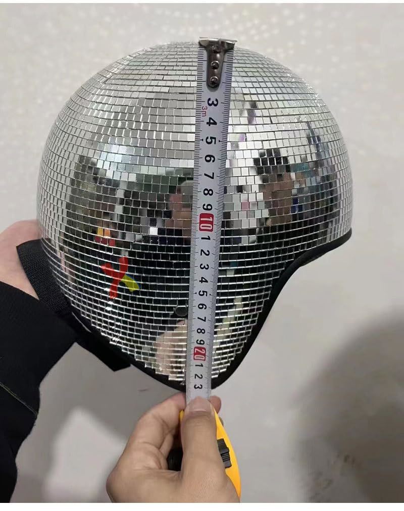 Product description: Step into the spotlight with this show-stopping Professional Mirror Ball Disco Helmet from Interoknack. Meticulously adorned with hundreds of reflective mirror tiles across its 9.8-inch spherical surface, this helmet transforms the wearer into a walking disco ball, creating mesmerizing light patterns that dance and sparkle in every direction. Perfect for performers, festival-goers, and party enthusiasts, this lightweight yet sturdy headpiece combines visual impact with practical wearability. The carefully engineered design maintains optimal visibility while delivering the classic mirror ball effect that has captivated audiences for generations. Whether you're heading to Burning Man, performing at an EDM festival, or creating unforgettable moments at themed events, this helmet promises to turn heads and create stunning photo opportunities. The durable construction ensures it can withstand the demands of dynamic performances while remaining comfortable for extended wear, making it an essential piece for anyone looking to make a dazzling statement.