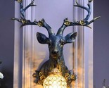 Product description: Transform your living space with this striking Vintage Lucky Deer Wall Lamp. This artistic wall sconce features a beautifully hand-carved blue resin stag head adorned with delicate plum blossom accents on its branched antlers. Measuring 23.6" x 20" x 8.7", this statement piece combines classical American retro style with contemporary design elements. The 9.8" diameter globe shade creates soft, ambient lighting perfect for living rooms, entryways, or as a distinctive accent on TV walls. Each lamp is meticulously crafted with intricate detailing, providing both decorative appeal and functional illumination. The hardwired installation ensures a seamless look once mounted. This unique deer head sconce serves as both a conversation piece and a symbolic decoration, bringing character and warmth to any interior setting.