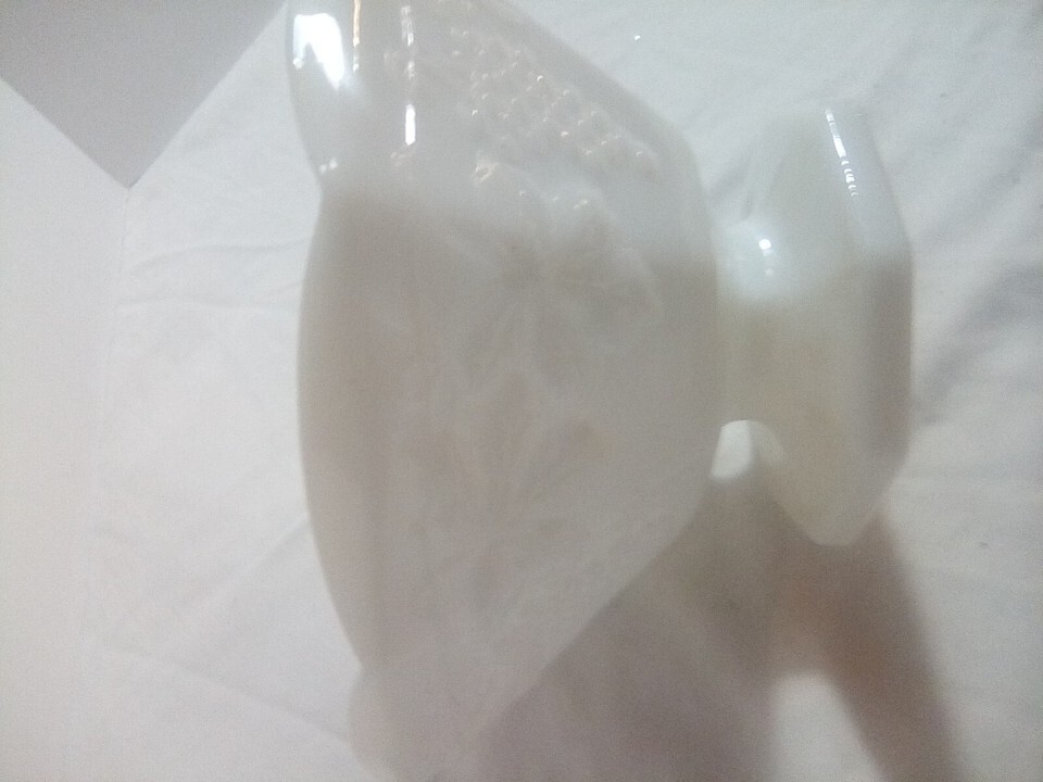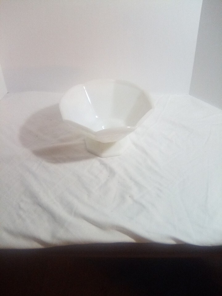9 in wide x 5 1/2 in tall octagonal milk glass candy dish with grape design