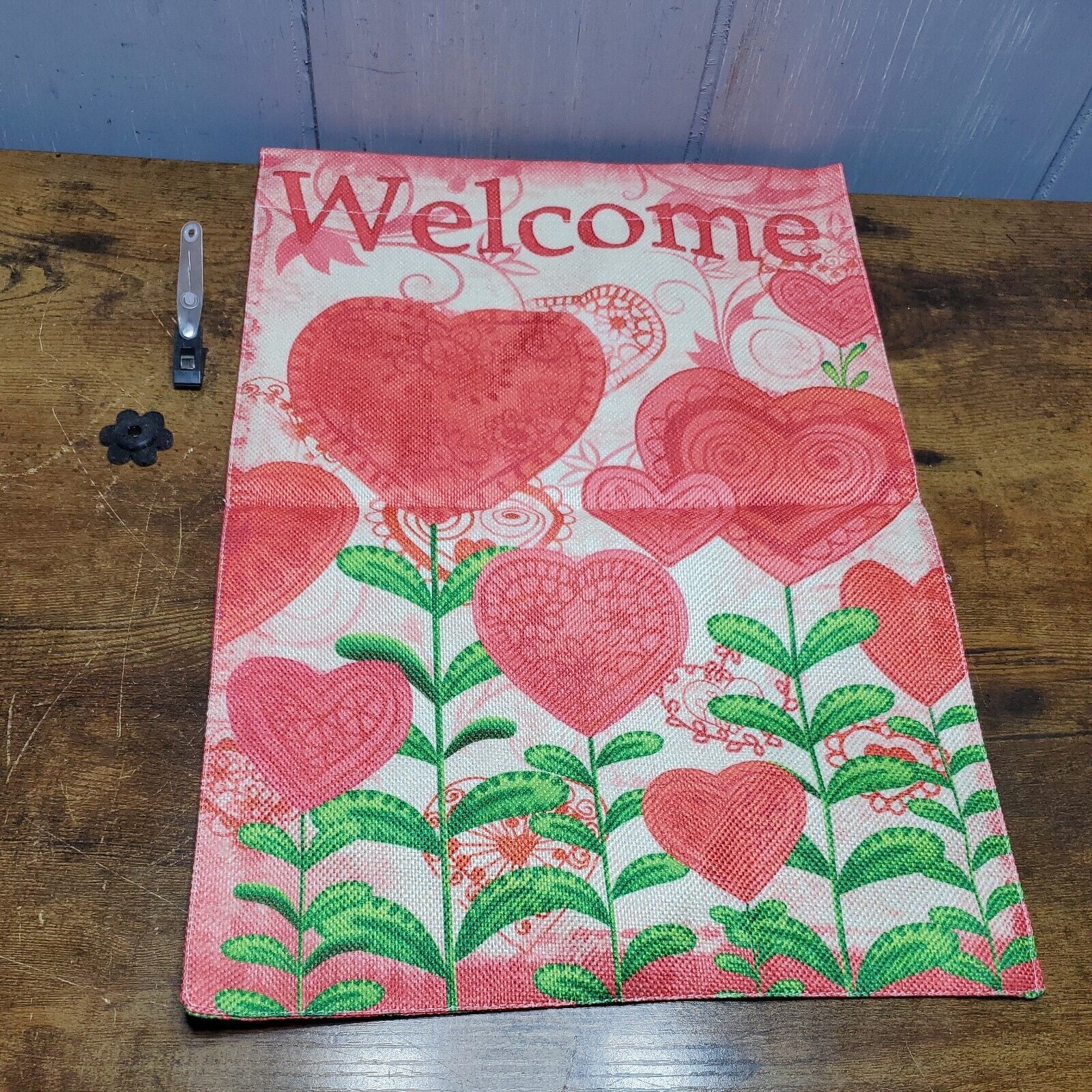mother's day garden flag with free anti-wind clip, burlap double sided love heart flower yard flag, welcome green leaves vertical house flag for outside, valentine outdoor decor, 12.5 x 18 inches