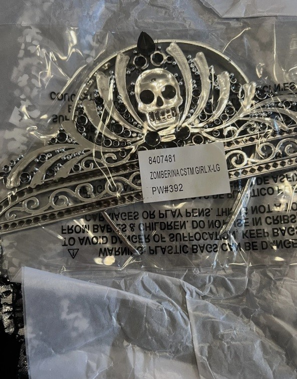 This two-piece costume includes a frightfully fab dress and a crown fit for royalty?if that royalty climbed out of a crypt. The black poly-knit dress is adorned with printed skulls and crossbones on the bodice, along with a haunting silver scroll design along the neckline that whispers, ?I dance for no man.? The skirt features layers of black organza that add volume and swirl with every step, while glittery printed graphics add an eerie sparkle under the moonlight (or the kitchen chandelier).
