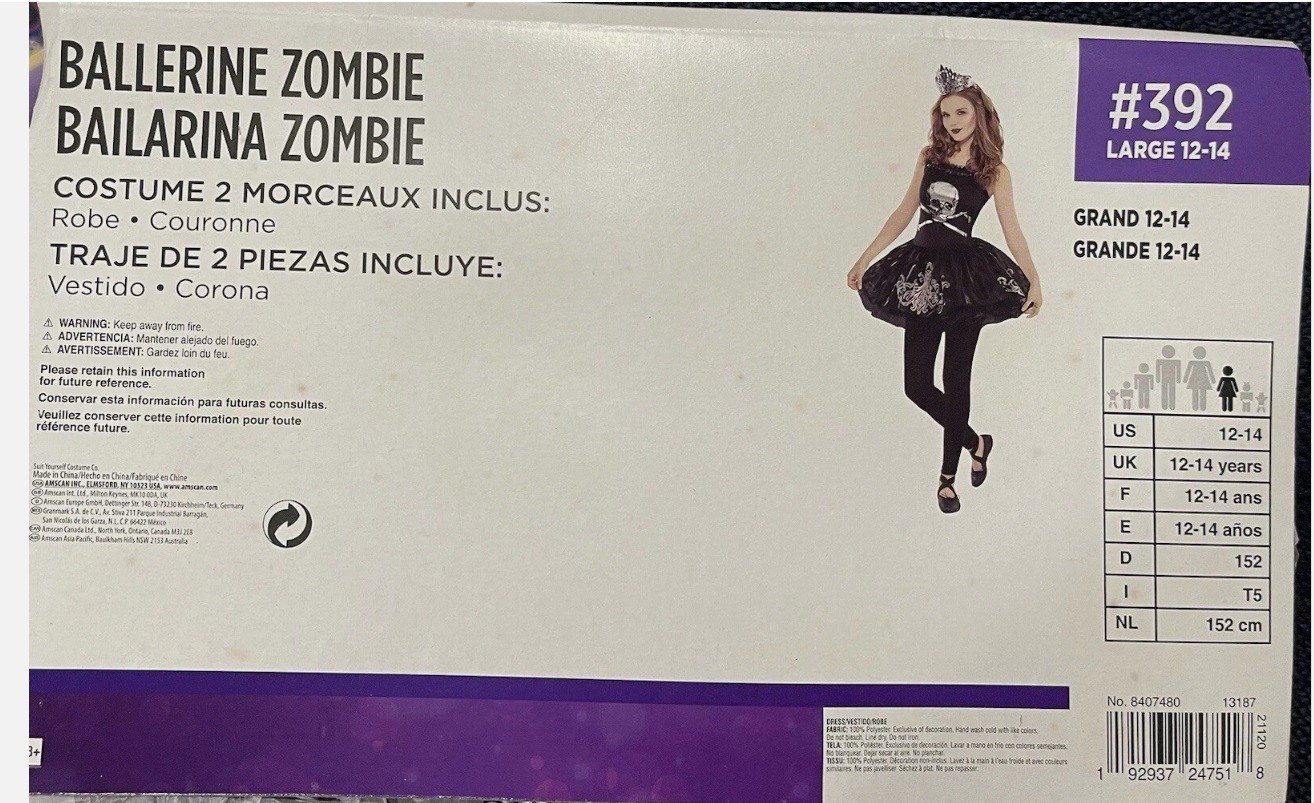 - new ZOMBERINA Costume YOUTH sz L (12-14) Ballerina Zombie Hallowen Dress + Crown