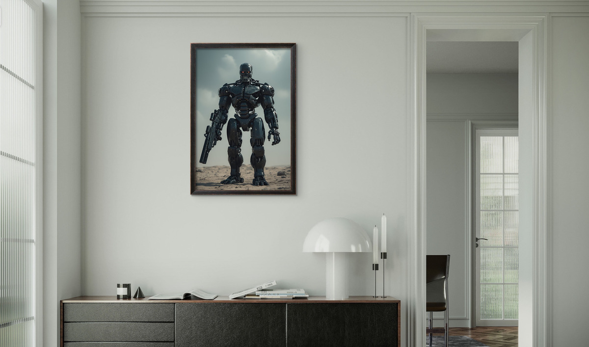 Obsidian Unit-09 is engineered for one purpose: end the mission, no matter the cost. Dressed in midnight-black armor polished like a predator’s shell, this mech stands in the desert haze like a walking omen. Its crimson eyes cut through the dust with a cold, unblinking stare — a reminder that this machine doesn’t hesitate, negotiate, or fear anything.